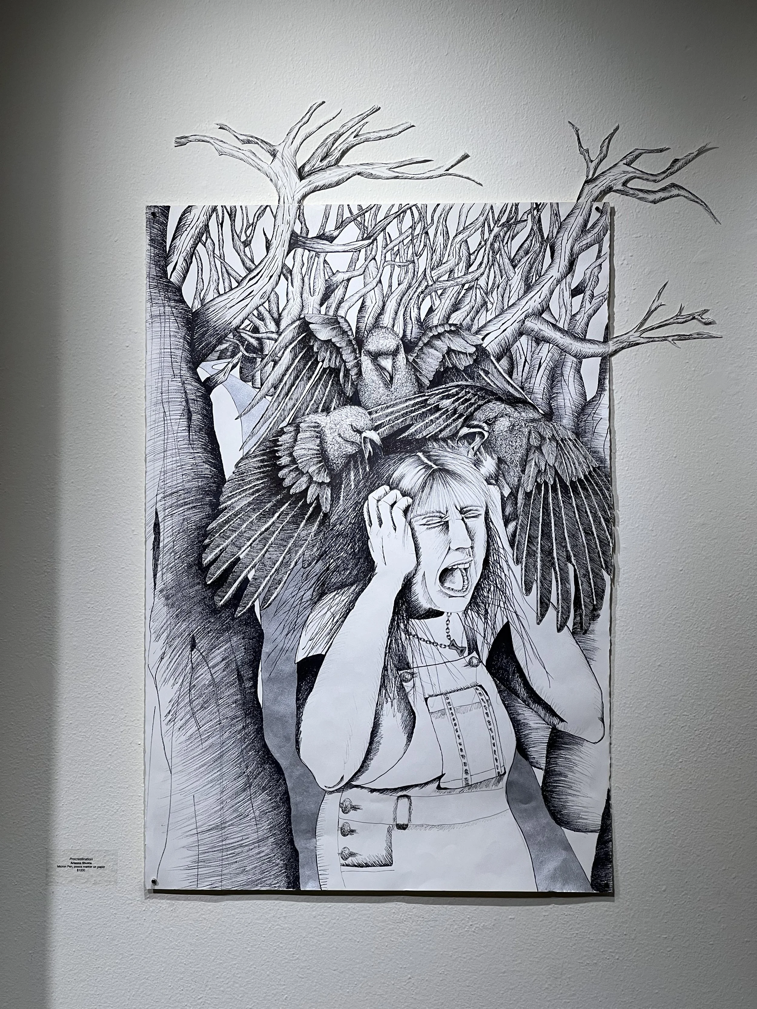 A self-portrait, Procrastination is what I would describe one of my own coping mechanisms. I tend to have a habit of ignoring things when they become stressful. When I do this, those things that I have been procrastinating always come back to me, often much worse. I have a voice in my head constantly telling me I need to face these situations rather than putting them off, which makes my stress even worse. There’s this frequent anxiety that appears because of time constraints, facing people, getting projects done, etc. Because of this, I decided to have ravens be the symbol of the negative side of this coping mechanism. Ravens are chatterboxes who mimic people, and will say things over and over again. I thought this was perfect because when I was trying to think of ways to depict the negative side of procrastination, I kept thinking about these birds screaming in my face, symbolizing all of the things that I have to get done but always seem to put off.