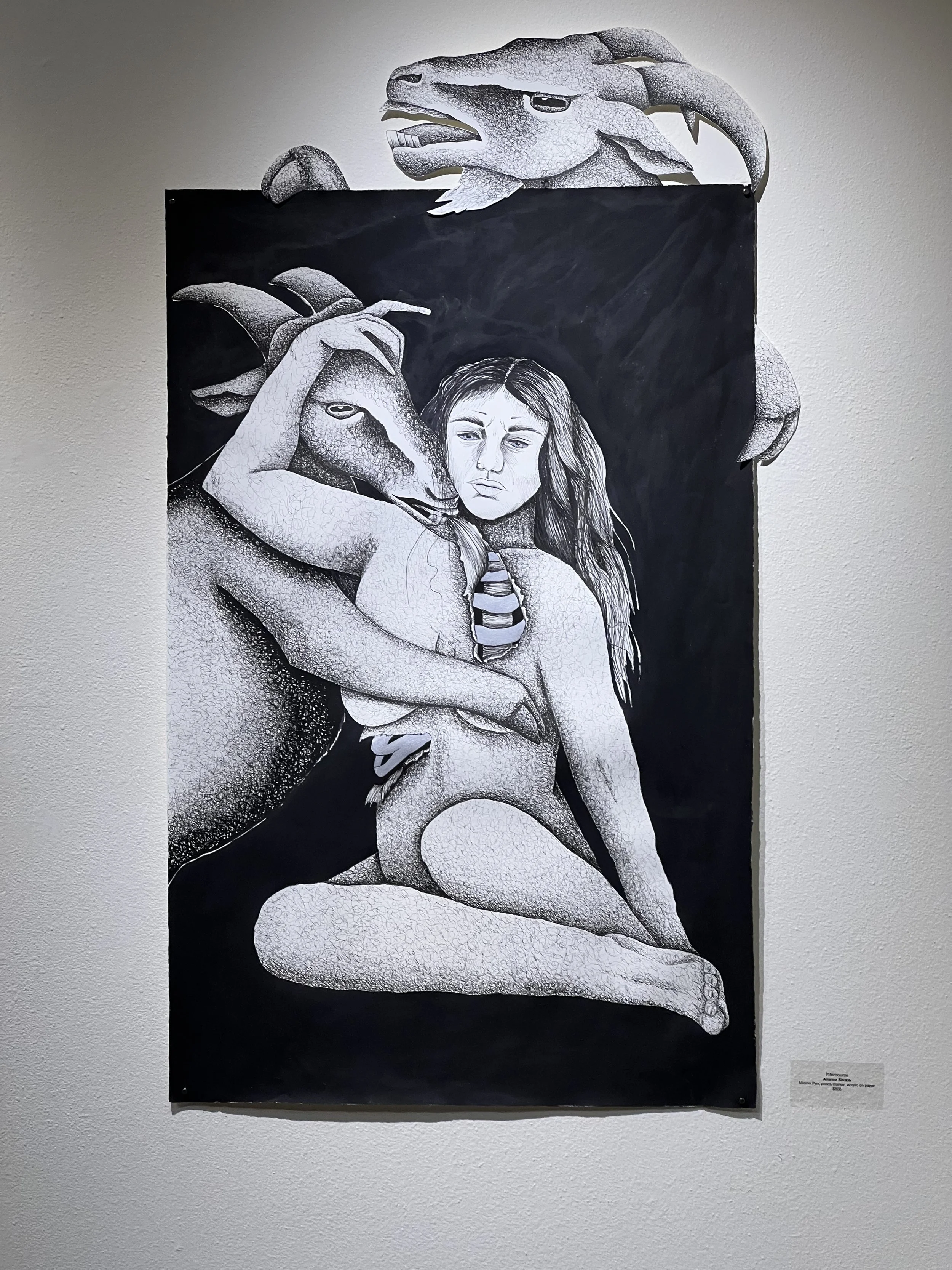 I looked up animal symbols for lust and I discovered that the goat is often used in Christian symbolism for lust. I thought this was interesting and decided to go with it. I wanted this piece to have a strong message, and chose to have the goat symbolize the negative side of intercourse by eating my friend, tearing away her flesh to expose an emptiness to her. She begins to become one with the goat, their bodies having the same chaotic markings as each other.