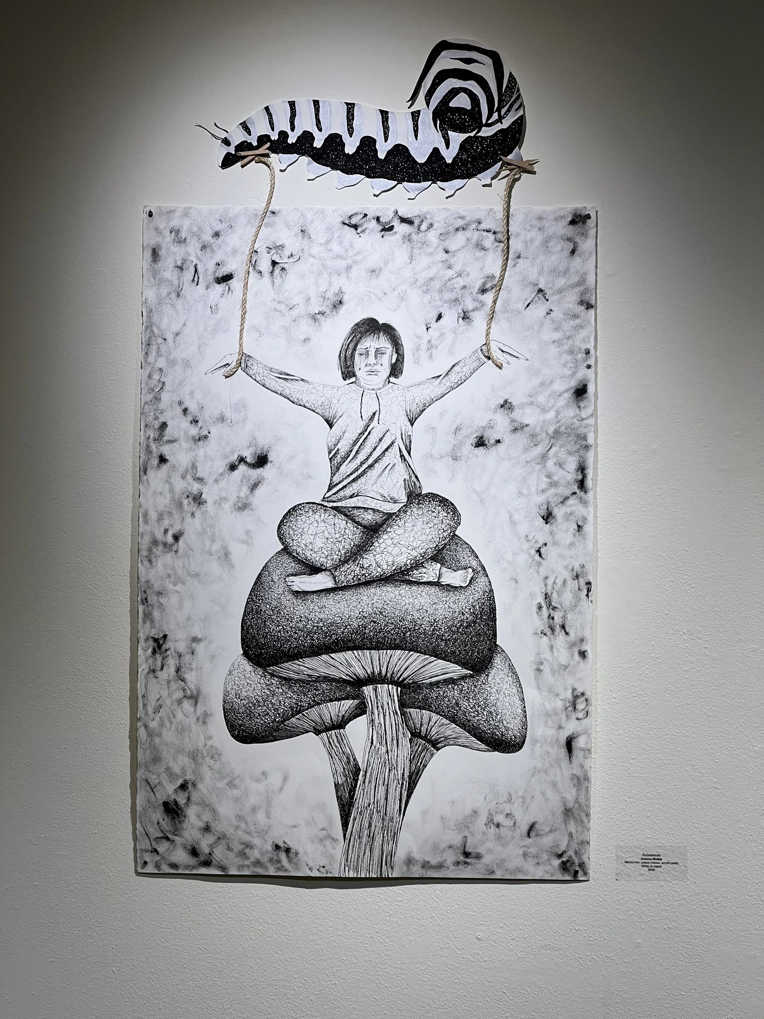I have always been inspired by nature and I wanted to include some sort of creature in each drawing to symbolize the negative counterpart of the escape. I did research on each animal and asked my friends their opinion on each to see if they thought it was an accurate representation for them. I additionally referenced Alice and Wonderland for two of the pieces, specifically the caterpillar and the forest background behind the ravens. Being able to talk to the people I was basing my art off of was extremely important to me because it brings a sense of intimacy into the pieces. I want people to understand how personal these drawings are to not only me, but others as well. It brings me the most satisfaction when the audience can find themselves within my work and relate to it, giving me a relationship with them through my art.