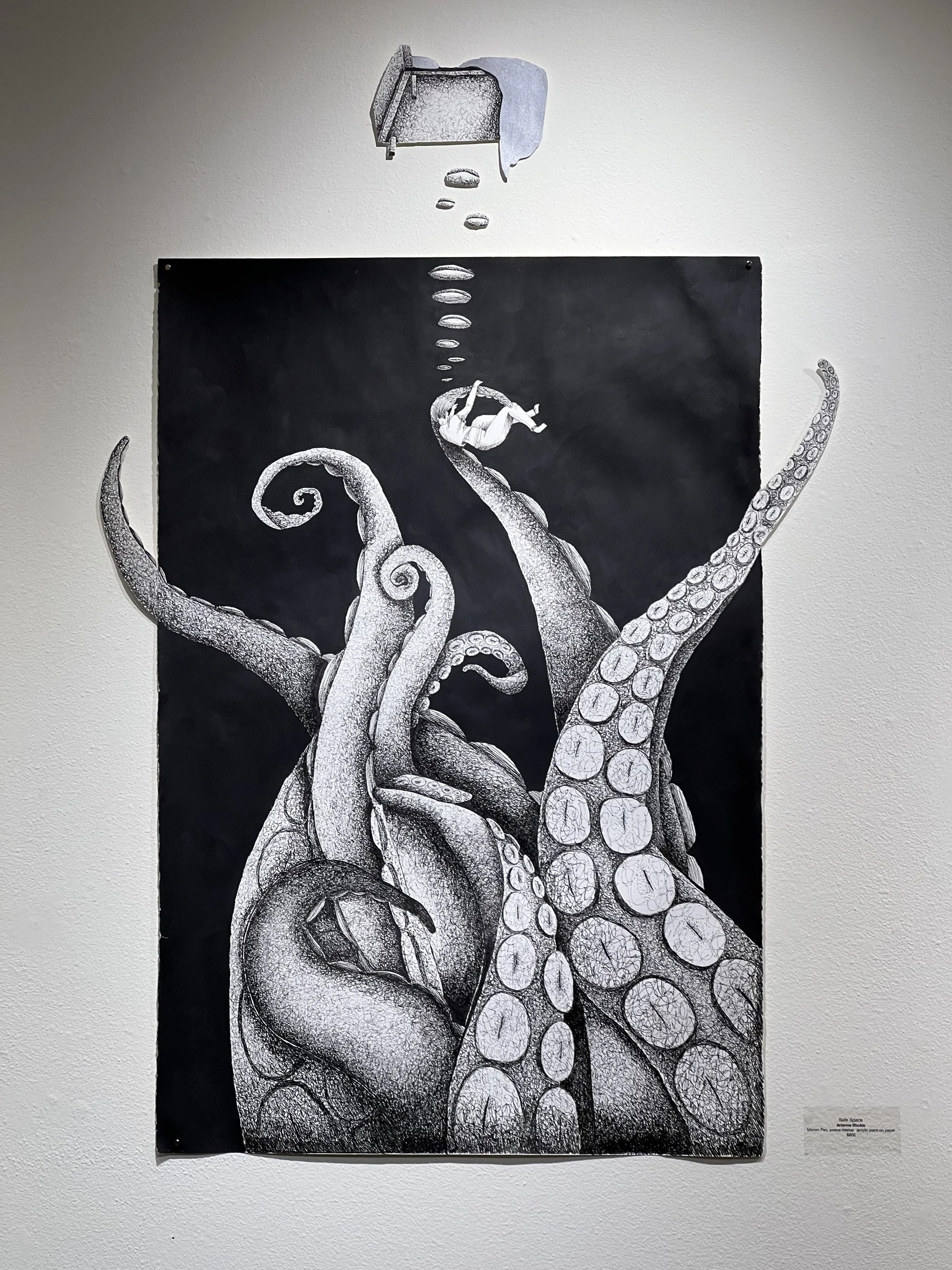 When thinking about this concept, I kept thinking about my friend sinking into a dark ocean of nothingness. She was actually in the studio when I was coming up with the idea. I was having trouble coming up with an idea for the animal for this piece, and she was the one who actually suggested an octopus since they live in deep water. I had made pieces that have featured octopi before that she had seen, and she thought it would be interesting to include one again.